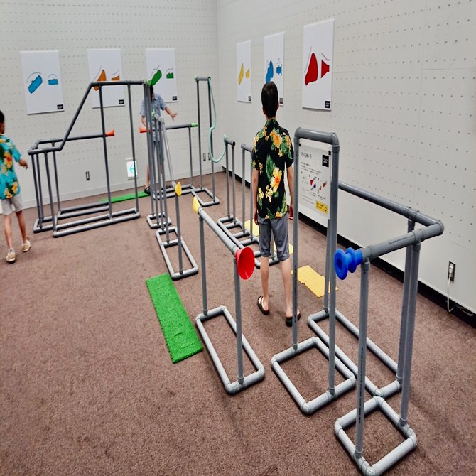 The pipes not only go up and down like a roller coaster, but are also broken in places. There are short distances that you can reach by jumping your hands, and long distances where you will get lost until the next pipe if you let go of the pipe. The key is that the beginning and end of the pipes have signs called “tactile parts”. You know which direction to move your hand up, down, left or right to grab the next pipe, so you move forward while absorbing the information with your touch. In other words, it implements “tactile affordances”. Earlier there was a “painting to look at with your hands”, but this one could be called a “maze to read with your hands”.