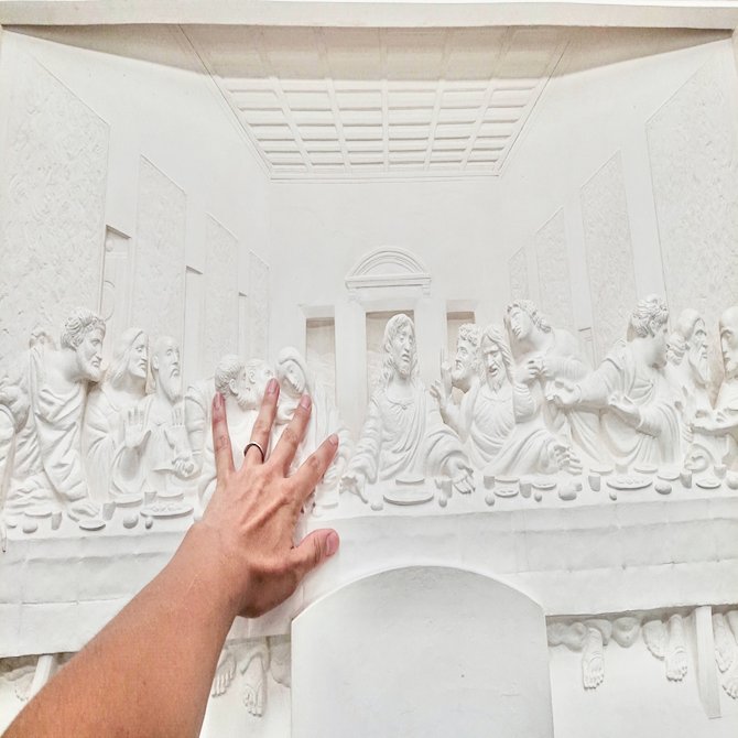 This is the “See with your hands” exhibition at the Anteros Art Museum Tokyo Branch. You can “touch” various paintings. Needless to say, it is intended to allow visually impaired people to appreciate art, and it is also a new way to enjoy art. Without hesitation, I stood in front of “The Last Supper,” closed my eyes, and touched the work. I thought I