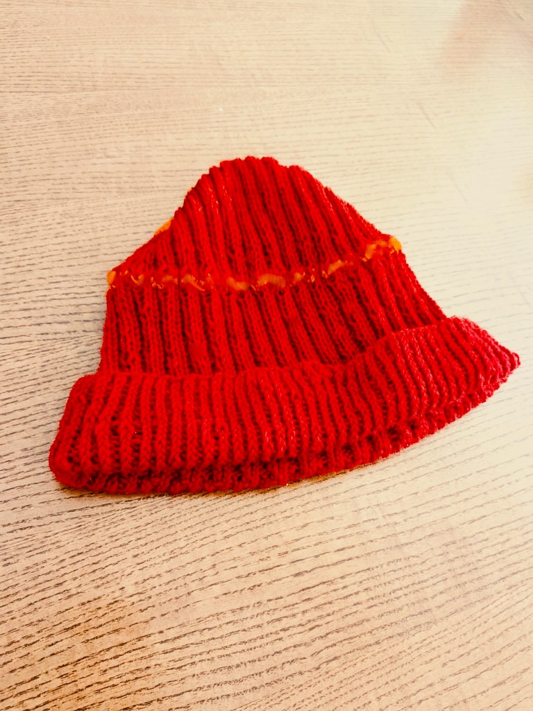 Knitting for someone else is tricky — especially judging the size. The yarn I bought was medium-weight wool, bright red. I’d once made a similar hat, casting on 150 stitches, and it fit my own head perfectly.
